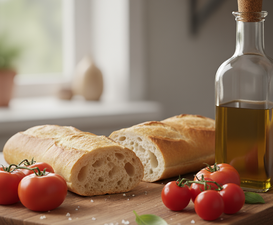 El pan ligeramente duro del día anterior es ideal, porque absorbe mejor el tomate y mantiene la textura crujiente.