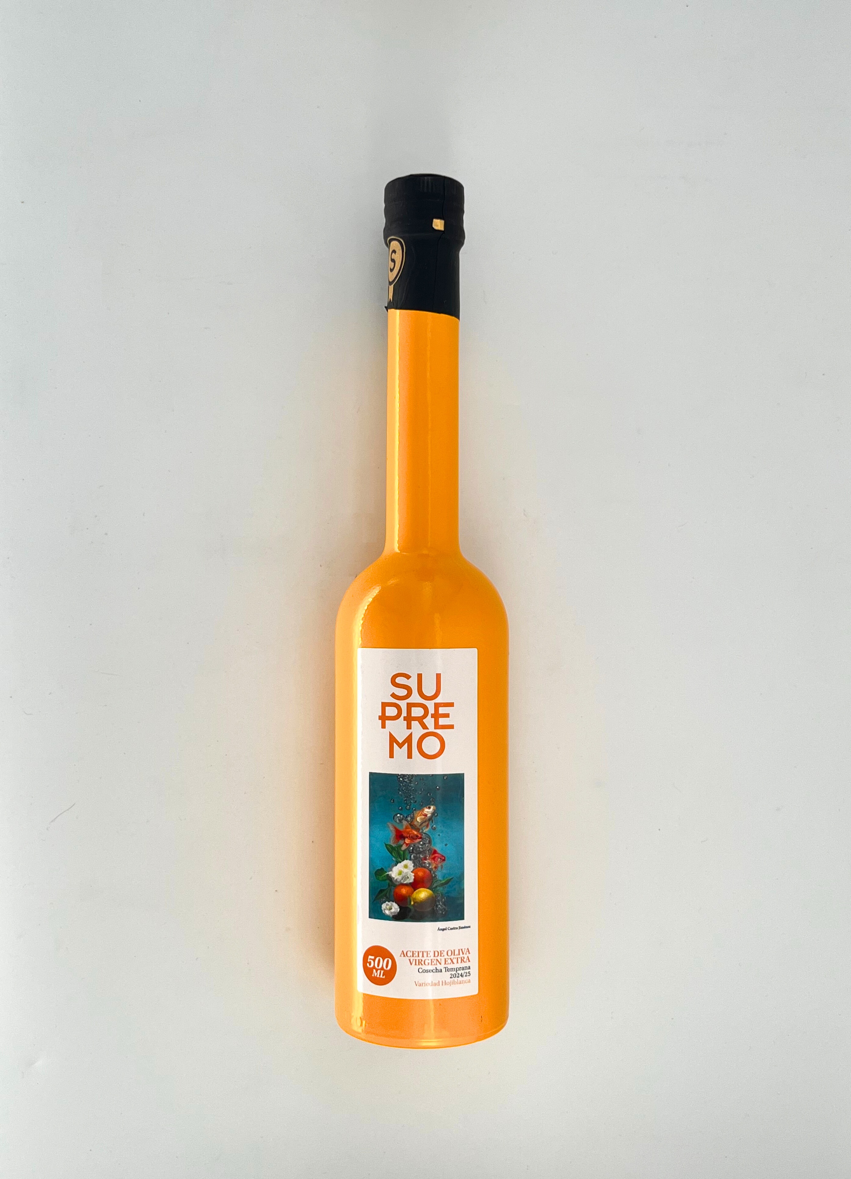Supremo trabaja con variedades de oliva como Arbosana y Cornezuelo de Jaén, produciendo aceites con perfiles sensoriales únicos. Consideran cada botella como una obra de arte, resultado de la pasión, el cuidado y el conocimiento de todo el proceso. Su lema refleja que cada gota representa el esfuerzo y la dedicación de su equipo.