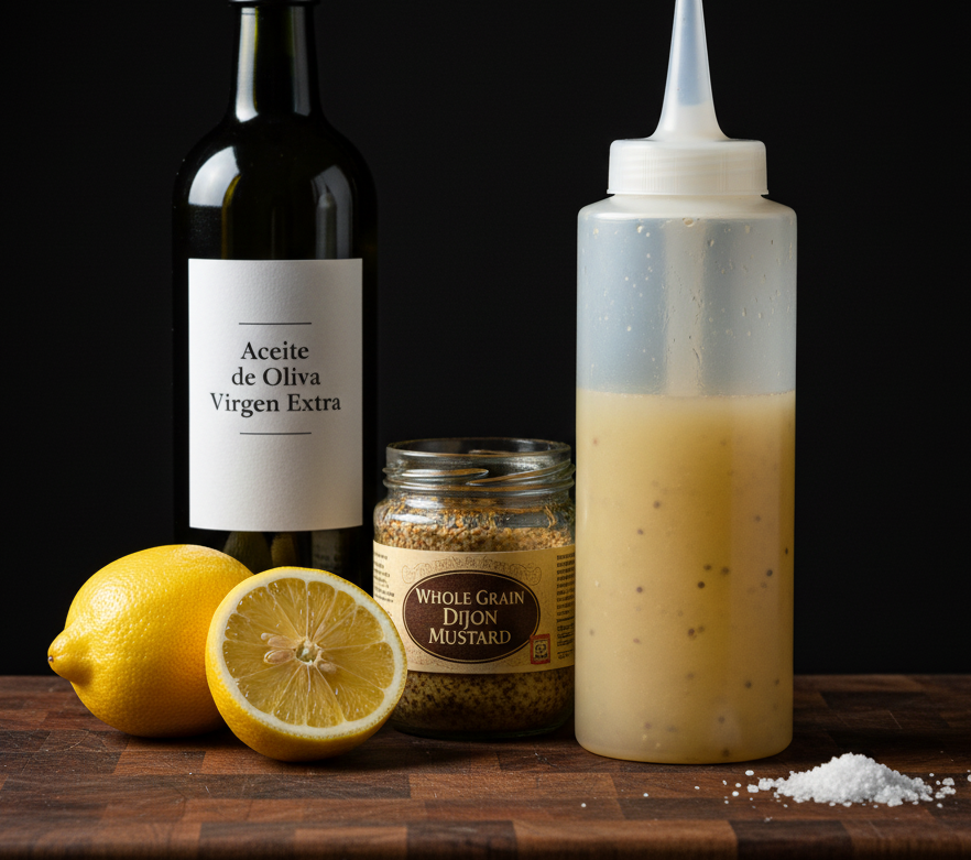 Salsa de aceite de oliva virgen extra con limón Ligera, fresca y lista en un minuto. Si buscas una vinagreta